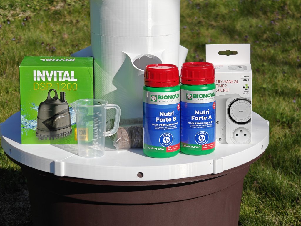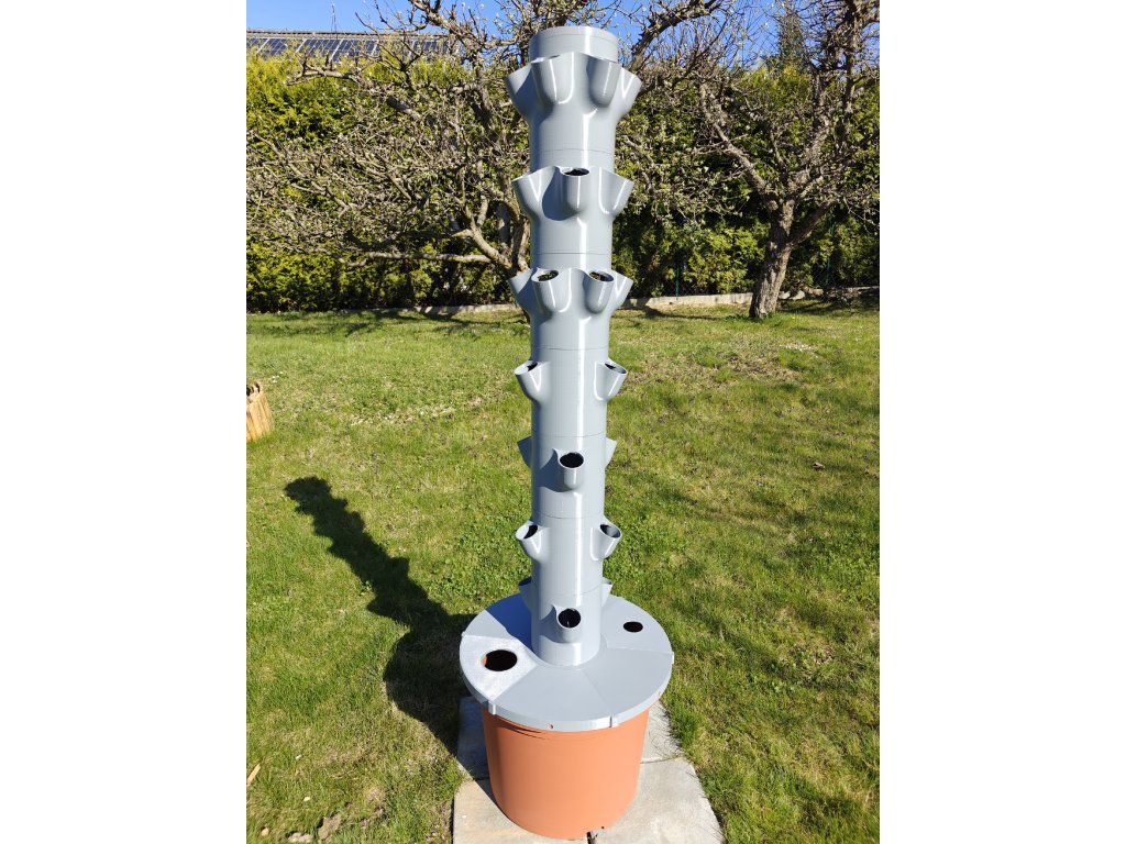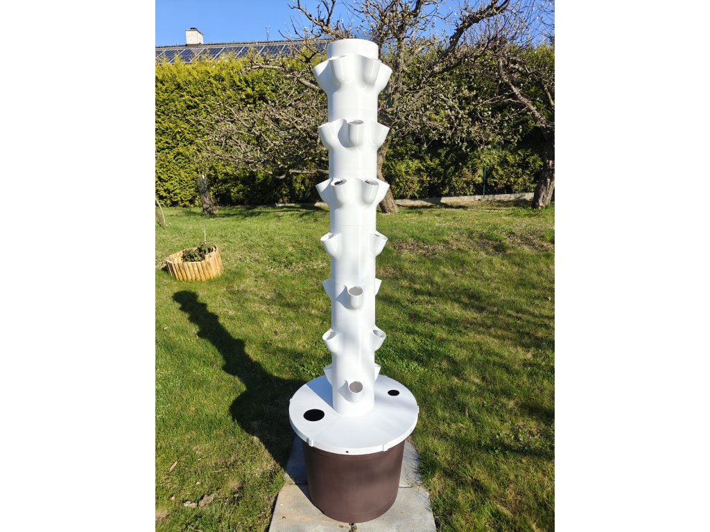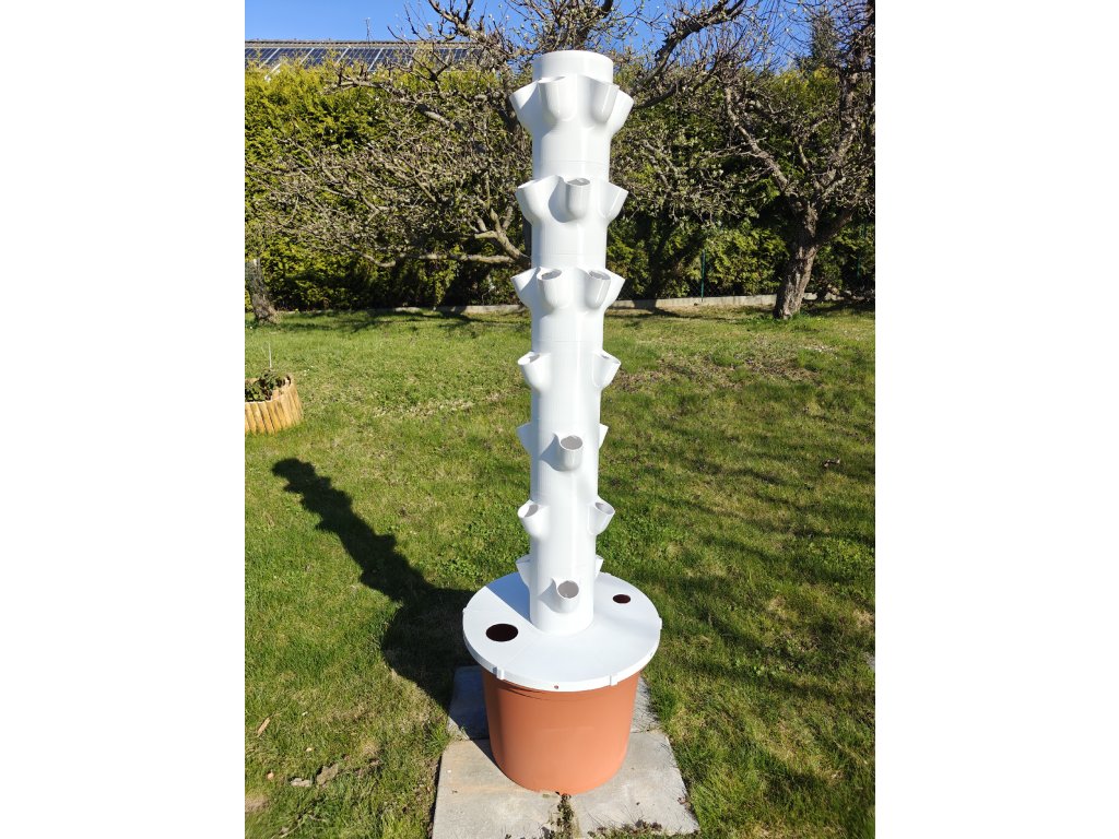 Jsou to vertikální hydroponické systémy, které umožňují pěstovat větší množství rostlin na malém prostoru. Pouze za pomocí vody a hnojiva. Naše věž má celkem 30 pozic, z toho je 12 určených pro pěstovaní zeleniny a zbylých 18 je pro pěstování bylinek, nebo menších druhů zeleniny. Objem nádrže je 45 l a celková výška cca 165cm.